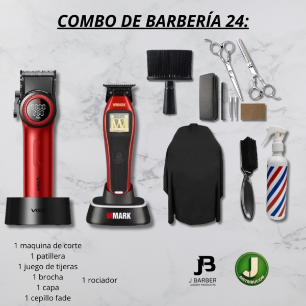 Maquina de corte, patillera, capa, cepillo fade, rociador, juego de tijeras, brocha.