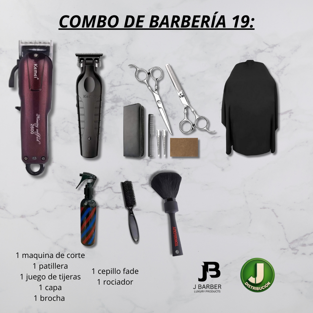 Maquina de corte, patillera, juego de tijeras, capa, brocha, cepillo fade, rociador.
