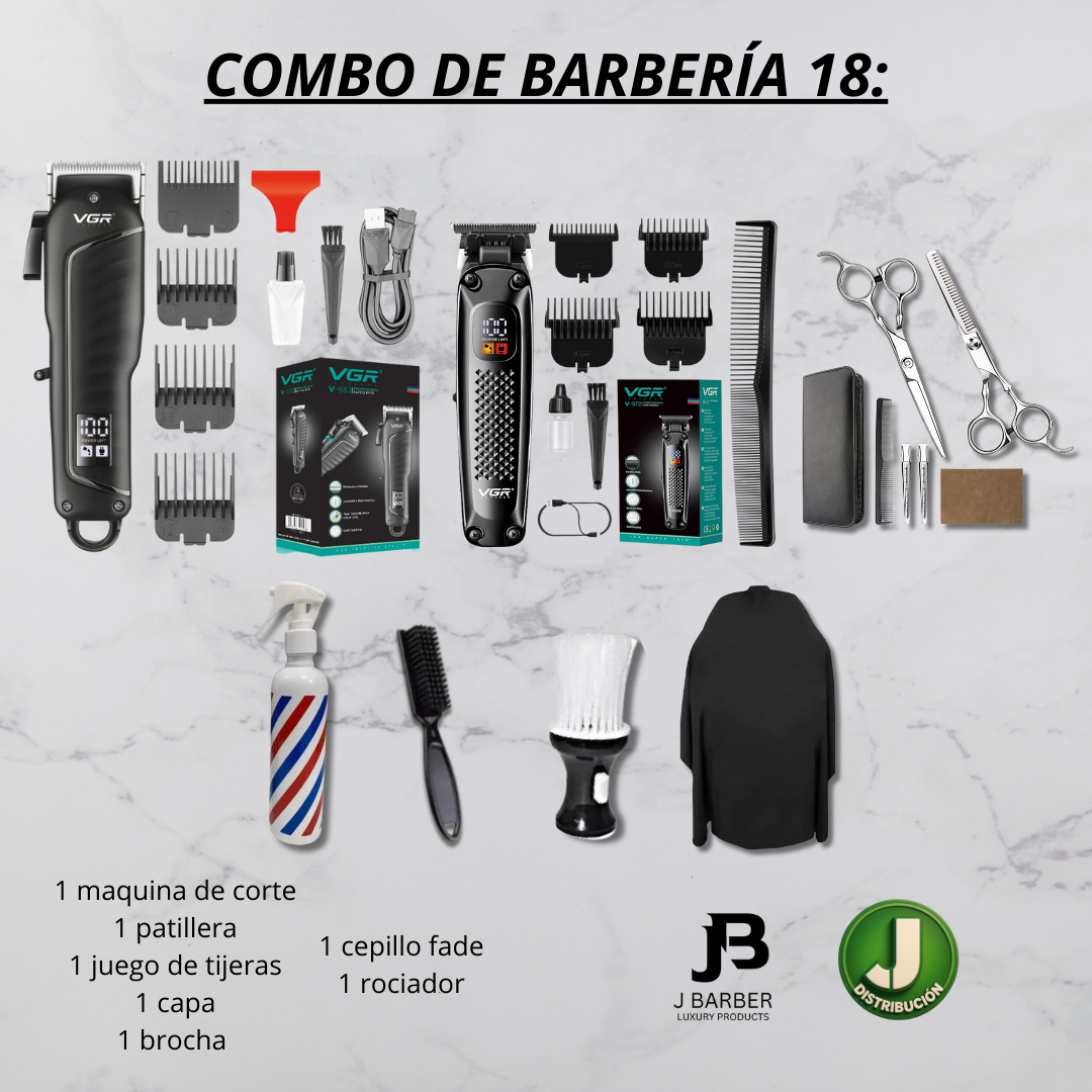 Maquina de corte, patillera, juego de tijeras, capa, brocha, cepillo fade, rociador.