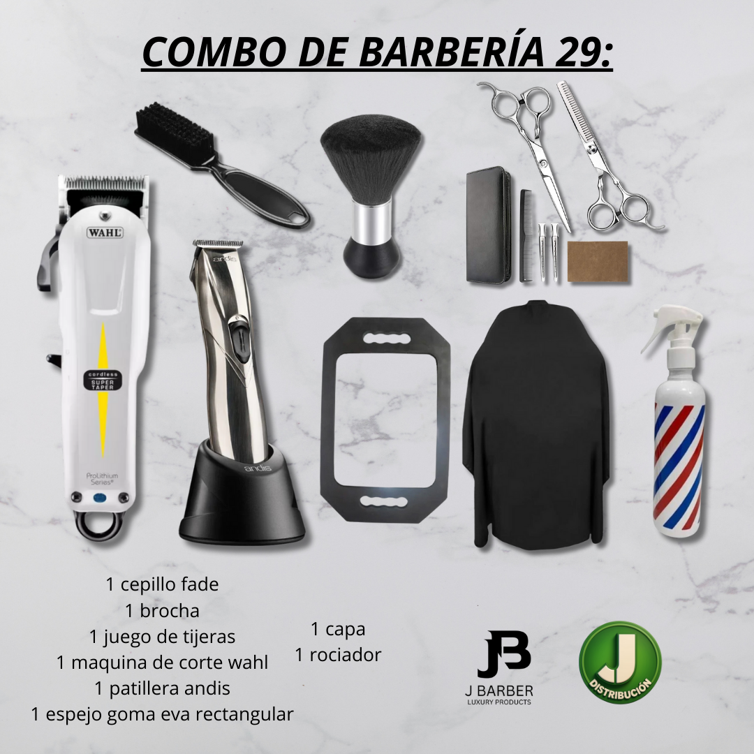 Maquina de corte, patillera, capa, espero goma eva, rociador, juego de tijeras, brochas, cepillo fade.